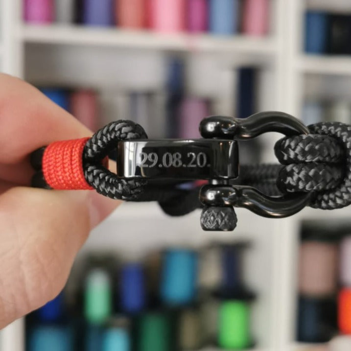 Jedes Armband dieser Kollektion wird nur aus den besten Materialien gefertigt und besteht aus hochwertigem 4-mm-Marineseil und einem vakuumlackierten, schwarzen, hypoallergenen 4-mm-Edelstahlschäkel. Der Bügel ist außerdem um 0,5 cm verstellbar, um eine bequeme Passform für jede Handgelenksgröße zu gewährleisten.