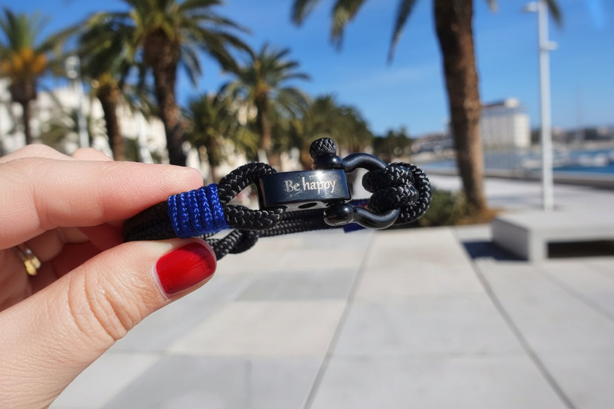 Izrađena korištenjem samo najfinijih materijala, svaka narukvica u ovoj kolekciji izrađena je od visokokvalitetnog pomorskog užeta od 4 mm i vakuumski obojenog crnog hipoalergenog okova od nehrđajućeg čelika od 4 mm. Okov je također podesiv za 0,5 cm kako bi se osiguralo udobno pristajanje za bilo koju veličinu zapešća.