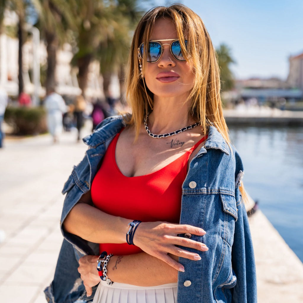 Svaka narukvica u našoj kolekciji izrađena je od visokokvalitetnog mornarsko plavog ili crnog upletenog užeta od 4 mm koji asocira na morske valove i hipoalergenskog okova od nehrđajućeg čelika od 4 mm koji je podesiv za 0,5 cm za udobno pristajanje. Naše narukvice s okovom dostupne su u bojama srebra, ružičastog zlata ili žutog zlata, što vam omogućuje da odaberete savršenu koja će nadopuniti vaš stil.